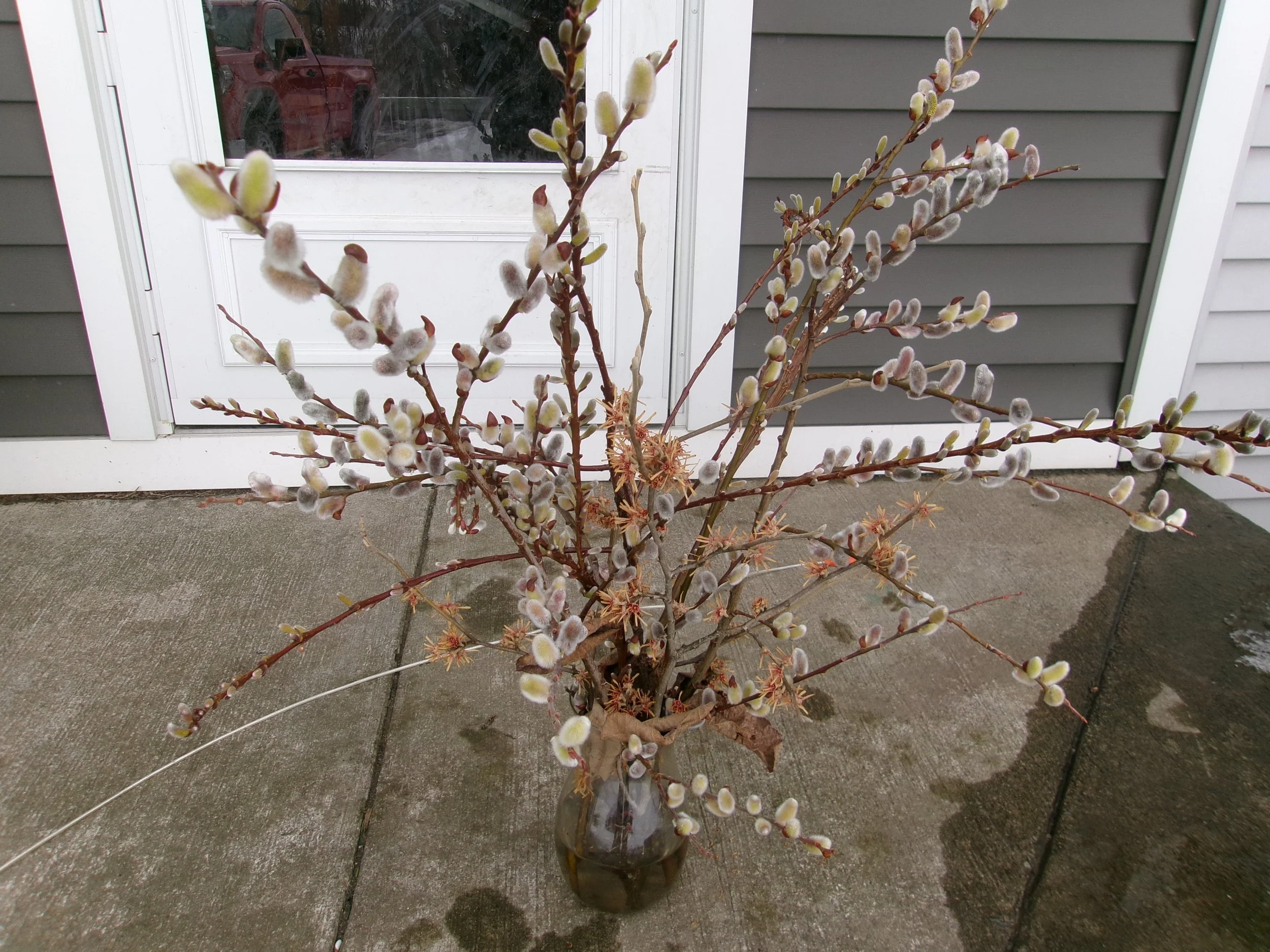 Several species of plants in the past few weeks have begun to bloom. Many can be brough into the house and forced as in this arrangement displayed here. This ensemble includes Hamamelis ‘Rochester’, Japanese Fantail Willow and Japanese Pussy Willow.