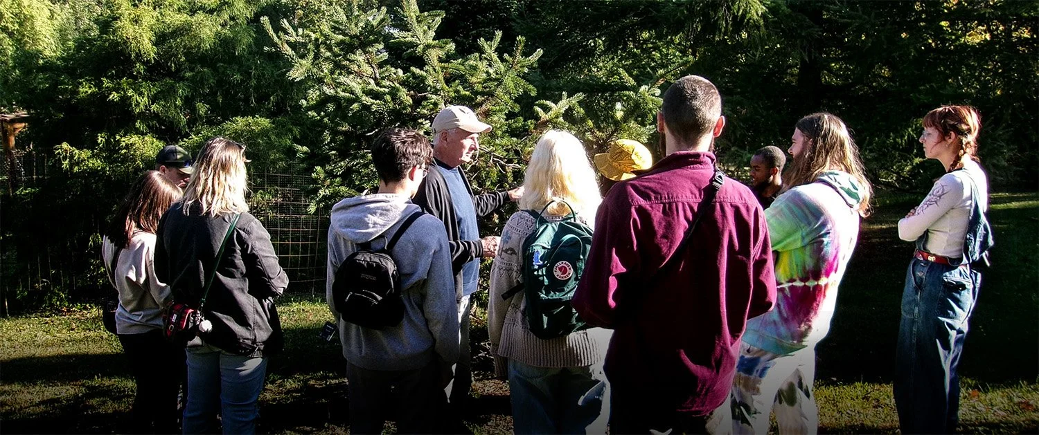 Bill Snyder instructing students on the key points of tree identification.